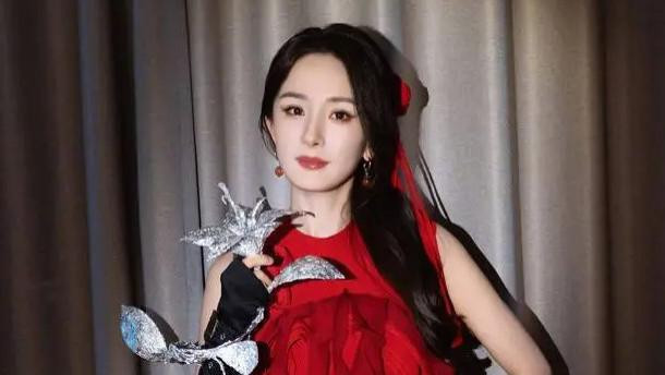 > 杨幂红色裙装搭羽毛发饰, 优雅与少女感并存