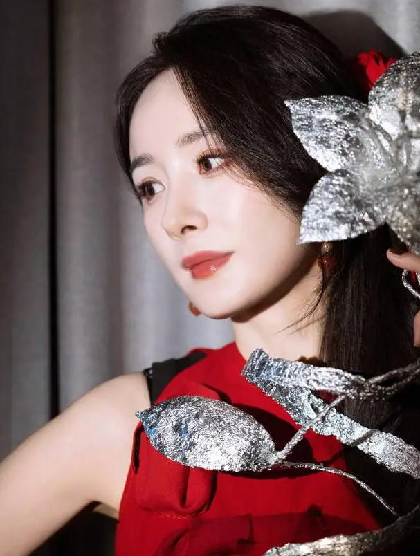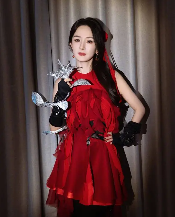 杨幂红色裙装搭羽毛发饰,优雅与少女感并存